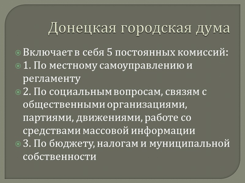 Донецкая городская дума Включает в себя 5 постоянных комиссий: 1. По местному самоуправлению и регламенту 2. По социальным вопросам, связям с общественными организациями, партиями, движениями, работе со средствами массовой информации 3. По бюджету, налогам и муниципальной собственности