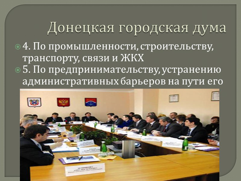 Донецкая городская дума 4. По промышленности, строительству, транспорту, связи и ЖКХ 5. По предпринимательству, устранению административных барьеров на пути его развития