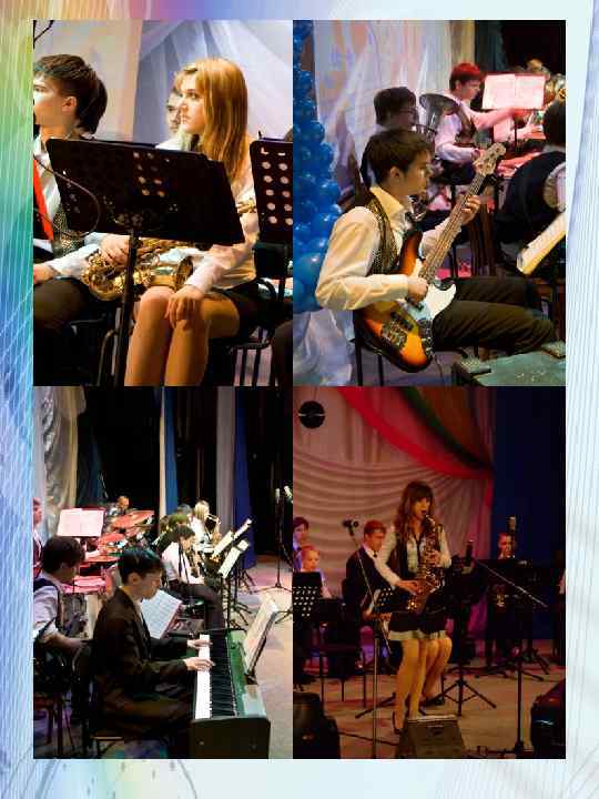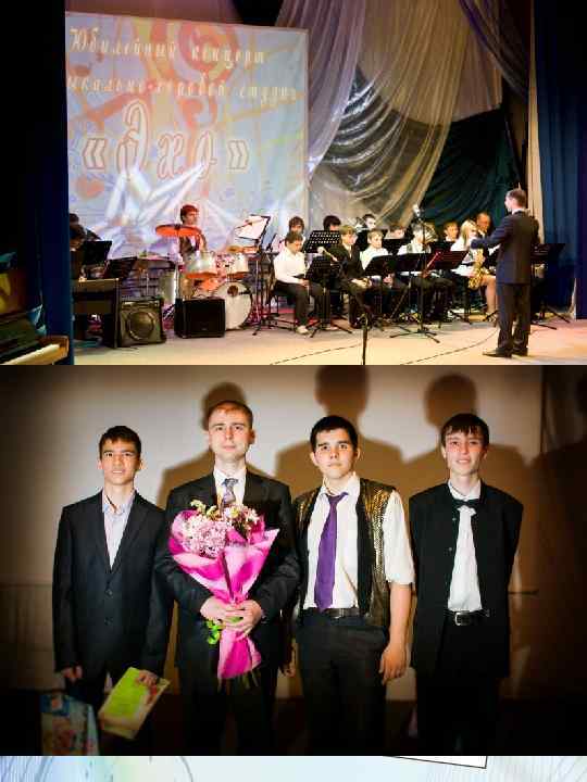 Немного о нас… • • • Хотелось бы подчеркнуть некоторых воспитанников студии «Эхо» в составе оркестра «Медные трубы» , которые опережают в развитии благодаря своим упорным занятиям, таланту, любви к искусству, музыке заслужили настоящую известность и признание в обществе нашего дворца, города и других городах. Максимов Алексей: выпускник студии «Эхо» (2012 г), победитель и призёр различных городских конкурсов и фестивалей; таких как «Юный музыкант» (г. Комсомольск-на-Амуре), «Конкурс юных эстрадных исполнителей» (г. Беларусь-2012 г), Всероссийский проект «Белый теплоход» (турне-2011). В оркестре исполняет партию бас гитары. Несмотря на окончание студии по сей день посещает занятия оркестра на добровольных началах. Заочно принят (по результатам прослушивания) в Училище Имени Гнесиных (г. Москва). Долгушина Татьяна (5 -й год обучения), Дышлевич Владимир ( 4 -й год обучения) -победители, призёры городских конкурсов и фестивалей: «Юный музыкант» » (г. Комсомольск-на-Амуре), «Конкурс эстрадных исполнителей» (г. Владивосток 2011, 2012). В оркестре Татьяна исполняет партию первого саксофона, а Владимир партию сопрано саксофона, усердно занимаются и радуют нас своими успехами. Тихонов Дмитрий: выпускник студии «Эхо» по классу фортепиано и тромбона, лауреат , победитель конкурсов «Юный музыкант» , получил Гранд При на Всероссийском конкурсе юных исполнителей (г. Владивосток 2012) и занял третье место на международном конкурсе в г. Петербурге (март 2013 г). После окончания студии продолжает посещать оркестровые занятия по собственному желанию. Собирается поступать в ГХККИ (Государственный Хабаровский Колледж Искусств). Тришина Таисия, Кузьмин Ян, Артюшенкова Светлана с первого года обучения (2012 г) начали активно осваивать муз. инструмент и быстро влились в состав оркестра. Успешно сдав первый экзамен по специальности (на « 5» ), они активно участвуют в выступлениях оркестра. Таисия исполняет партию саксофона-тенора, Ян играет на кларнете, Светлана на сопраносаксофоне. Все эти ребята настроены жизнерадостно, творчески развиваются на основе лучших образов мировой музыкальной культуры , продолжают совершенствоваться как исполнители, социально устойчивы, энергичны, ведут здоровый образ жизни, некоторые желают продолжить музыкальное образование.