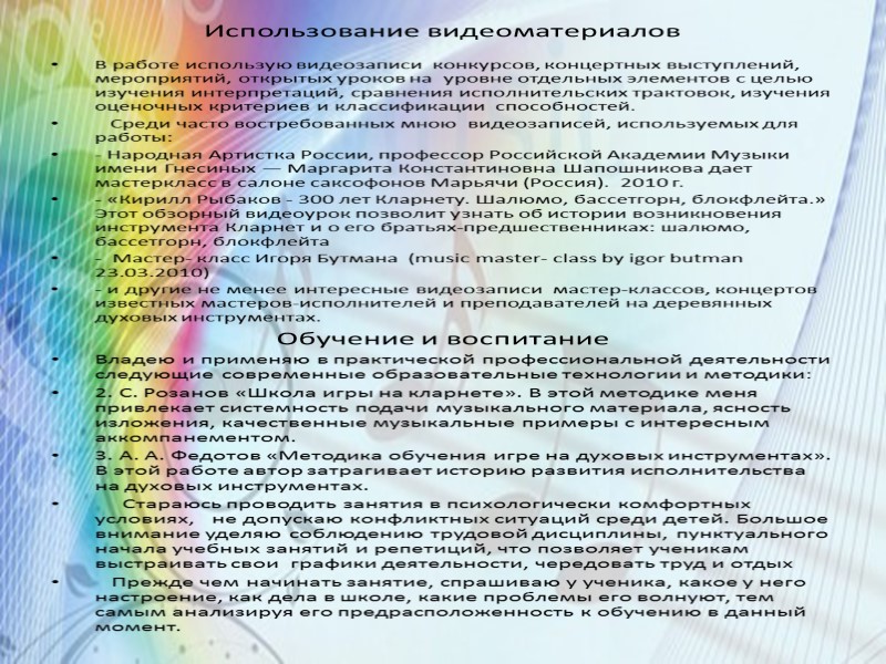 В работе использую видеозаписи конкурсов, концертных выступлений, мероприятий, открытых уроков на уровне отдельных элементов с целью изучения интерпретаций, сравнения исполнительских трактовок, изучения оценочных критериев и классификации способностей. Среди часто востребованных мною видеозаписей, используемых для работы: - Народная Артистка России, профессор Российской Академии Музыки имени Гнесиных — Маргарита Константиновна Шапошникова дает мастеркласс в салоне саксофонов Марьячи (Россия). 2010 г. - «Кирилл Рыбаков - 300 лет Кларнету. Шалюмо, бассетгорн, блокфлейта.» Этот обзорный видеоурок позволит узнать об истории возникновения инструмента Кларнет и о его братьях-предшественниках: шалюмо, бассетгорн, блокфлейта - Мастер- класс Игоря Бутмана (music master- class by igor butman 23.03.2010) - и другие не менее интересные видеозаписи мастер-классов, концертов известных мастеров-исполнителей и преподавателей на деревянных духовых инструментах. Обучение и воспитание Владею и применяю в практической профессиональной деятельности следующие современные образовательные технологии и методики: 2. С. Розанов «Школа игры на кларнете». В этой методике меня привлекает системность подачи музыкального материала, ясность изложения, качественные музыкальные примеры с интересным аккомпанементом. 3. А. А. Федотов «Методика обучения игре на духовых инструментах». В этой работе автор затрагивает историю развития исполнительства на духовых инструментах. Стараюсь проводить занятия в психологически комфортных условиях, не допускаю конфликтных ситуаций среди детей. Большое внимание уделяю соблюдению трудовой дисциплины, пунктуального начала учебных занятий и репетиций, что позволяет ученикам выстраивать свои графики деятельности, чередовать труд и отдых Прежде чем начинать занятие, спрашиваю у ученика, какое у него настроение, как дела в школе, какие проблемы его волнуют, тем самым анализируя его предрасположенность к обучению в данный момент. Использование видеоматериалов
