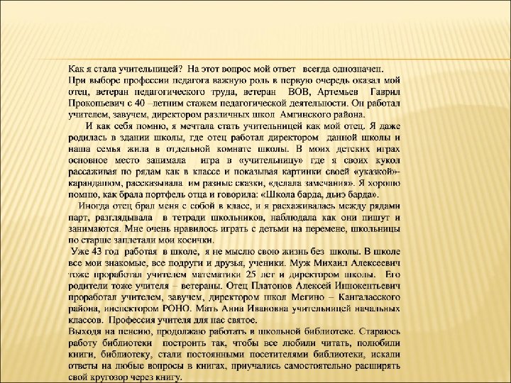 II. КАРТА ПРОФЕССИОНАЛЬНОГО РОСТА За последние три года трудовой деятельности Платонова Надежда Гаврильевна принимала участие в следующих мероприятиях: Республиканские и городские мероприятия Участница республиканского фестиваля художественного творчества трудового коллективов РС (Я) «Славим трудом Олонхо» . Педагогический опыт распространен на республиканских курсах библиотекарей РС(Я) ИПКРО им. С. Н. Донского 27. 07. 2010 г. Участница художественной самодеятельности на концерте образовательных учреждений г. Якутска 01. 12. 2008 г. Участница книжной выставки «Для, Вас родители» в связи с Годом Семьи организованном Администрацией п. Марха декабрь 2008 г. Активная участница в профсоюзном конкурсе «Новогодняя игрушка Советского периода» среди образовательных учреждений г. Якутска. Декабрь 2009 г. Участница школьных и городских профсоюзных мероприятиях в связи с празднованием Нового 2010 года 20. 12. 2010 г. Активная участница в шахматном турнире среди ветеранов п. Марха и в шахматном турнире «Папа, мама, я – шахматная семья» посвященном 65 -летию Победы ВОВ среди подростковых клубов г. Якутска. 21. 03. 2010 г. Участница художественной самодеятельности профсоюзных образовательных учреждений г. Якутска в связи с Годом Учителя в России. Май 2010 г. Республиканские и городские педагогические чтения «Образование и образованность в культуре современного общества» 2006 г. Участница «Самсоновского чтения» на секции » Психологические науки» . МО РС(Я) 6 февраля 2009 г. На смотре городских школьных библиотек по теме «Оформление и дизайн ШБ» критериями осмотра установлен самый наибольший бал - 60. Участница «Колосовского чтения» на 12 научно-практической конференции 24 марта 2009 г.