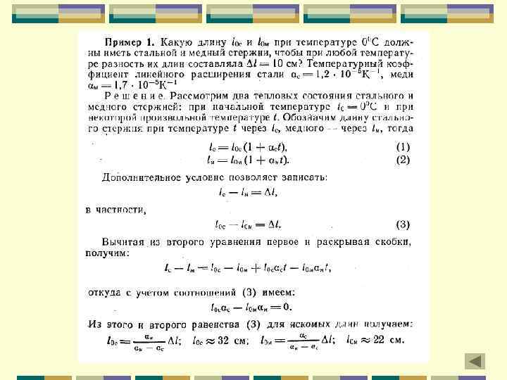 Задача: К концам стальной проволоки длиной 3 м и сечением 1 мм 2 приложены растягивающие силы по 210 Н каждая. Найти абсолютное и относительное удлинение Дано: l 0 = 3 см мм 2 S=1 F = 210 H l -? e -? l=l-l 0 (1) l E= l 0 (2) F s= (3) S s= E*e (4) S = E*e Из (5) e= F * l 0 Е= S*E (6) Из (6) l= F * l 0 (7) S*E 210 H e=1 мм 2 * 210 ГПа (3) = (4) F По физическому смыслу модуля Юнга (5) F S*E l= 210 H * 3 м = 10 -3 = 3 мм 1 мм 2 * 210 ГПа