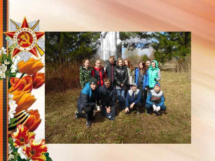 Ожидаемые/фактические результаты Отреставрированный памятник воинуосвободителю в д. Втюринское. Ø Чистота и порядок на территории, прилегающей к памятнику. Ø Ухоженная и оформленная цветочными клумбами территория возле памятника. Ø Аллея Славы в честь погибших воинов. Ø Гордость за свою Родину, земляков, защищавших наше Отечество в годы Великой Отечественной войны. Ø Желание изучать историю своей малой родины и страны в целом. Ø
