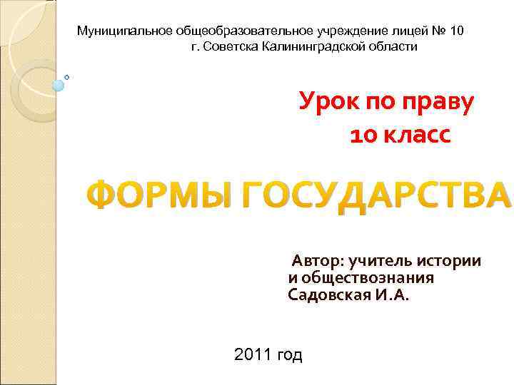 Муниципальное общеобразовательное учреждение лицей № 10 г. Советска Калининградской области Урок по праву 10 класс ФОРМЫ ГОСУДАРСТВА Автор: учитель истории и обществознания Садовская И. А. 2011 год