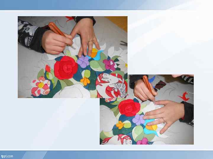 Правила безопасности во время работы o На рабочем месте должно быть хорошее освещение. o Свет должен падать с левой стороны. o Работать лучше возле окна при дневном свете. o Осторожно пользоваться резаком и ножницами. o При работе с клеем помещение должно быть проветриваемым. o Клей намазывать на небольшие участки.