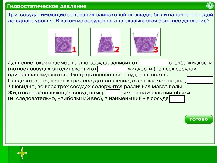 Фронтальный опрос § Как передают давление жидкости и газы? § На каком опыте можно показать особенность передачи давления жидкостями и газами? § Как читается закон Паскаля? § Как доказать, что внутри жидкости существует давление? § От чего оно зависит? § Как на опытах показать, что давление внутри жидкости на разных уровнях разное, а на одном и том же уровне во всех направлениях одинаково? § Почему во многих случаях не принимают во внимание давление газа, созданное его весом?