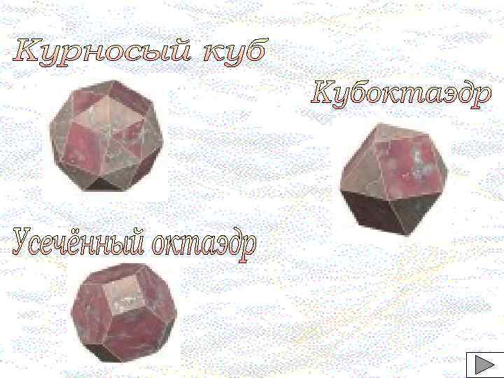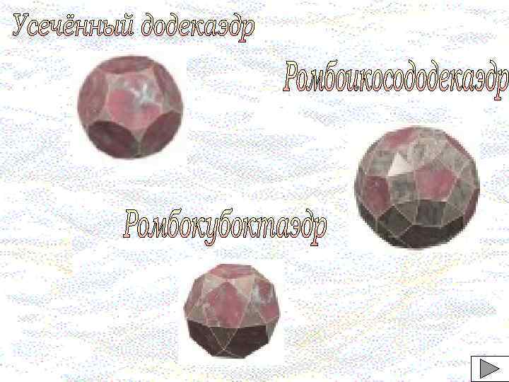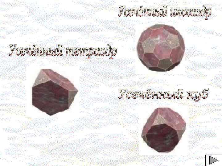 Название многогранника В Р Г В+Г-Р=2 (Вершины) (ребра) (грани) (формула Эйлера) Вид Грани Правильный тетраэдр 4 6 4 2 Правильный треугольник Правильный октаэдр 6 12 8 2 Правильный икосаэдр 12 30 20 2 Правильный треугольник Правильный гексаэдр Правильный додекаэдр 8 12 6 2 20 30 12 2 Правильный квадрат Правильный пятиугольник
