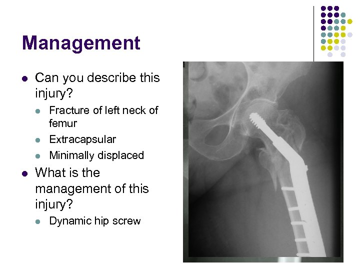 Management l Can you describe this injury? l l Fracture of left neck of femur Extracapsular Minimally displaced What is the management of this injury? l Dynamic hip screw