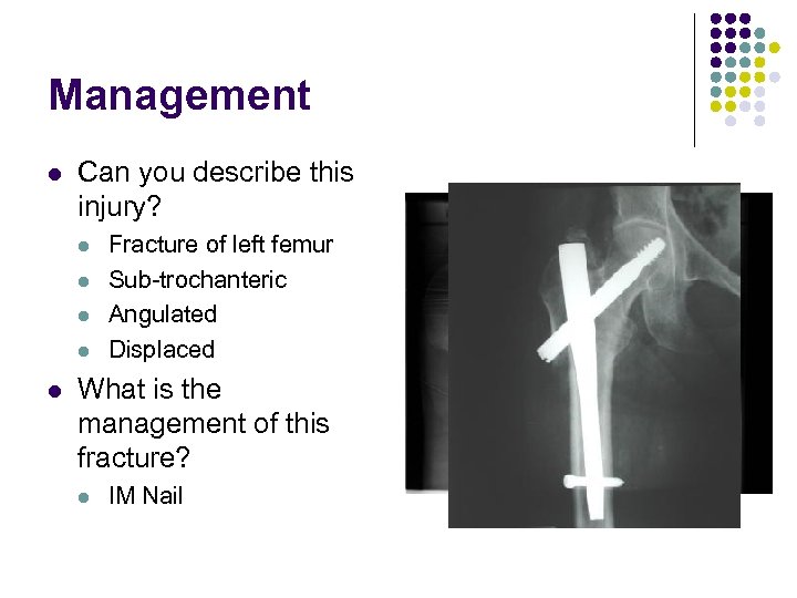 Management l Can you describe this injury? l l l Fracture of left femur Sub-trochanteric Angulated Displaced What is the management of this fracture? l IM Nail