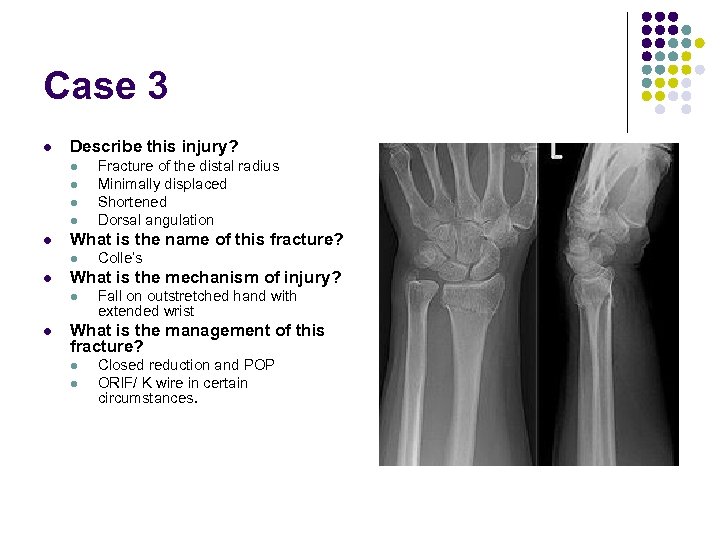 Case 3 l Describe this injury? l l l What is the name of this fracture? l l Colle’s What is the mechanism of injury? l l Fracture of the distal radius Minimally displaced Shortened Dorsal angulation Fall on outstretched hand with extended wrist What is the management of this fracture? l l Closed reduction and POP ORIF/ K wire in certain circumstances.