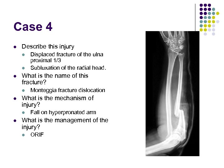 Case 4 l Describe this injury l l l What is the name of this fracture? l l Monteggia fracture dislocation What is the mechanism of injury? l l Displaced fracture of the ulna proximal 1/3 Subluxation of the radial head. Fall on hyperpronated arm What is the management of the injury? l ORIF