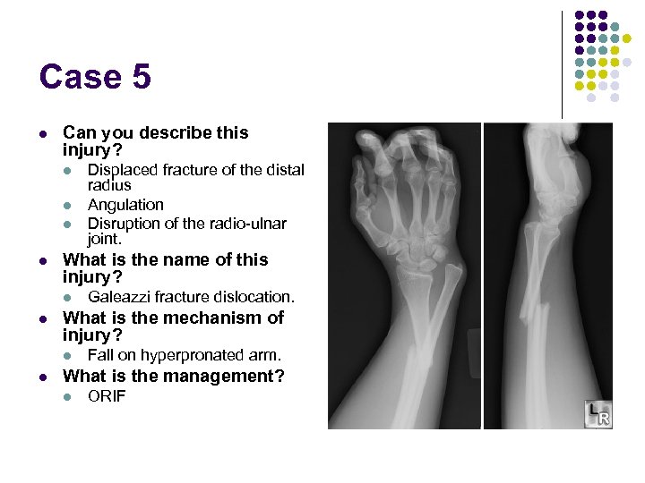 Case 5 l Can you describe this injury? l l What is the name of this injury? l l Galeazzi fracture dislocation. What is the mechanism of injury? l l Displaced fracture of the distal radius Angulation Disruption of the radio-ulnar joint. Fall on hyperpronated arm. What is the management? l ORIF