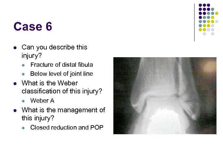 Case 6 l Can you describe this injury? l l l What is the Weber classification of this injury? l l Fracture of distal fibula Below level of joint line Weber A What is the management of this injury? l Closed reduction and POP