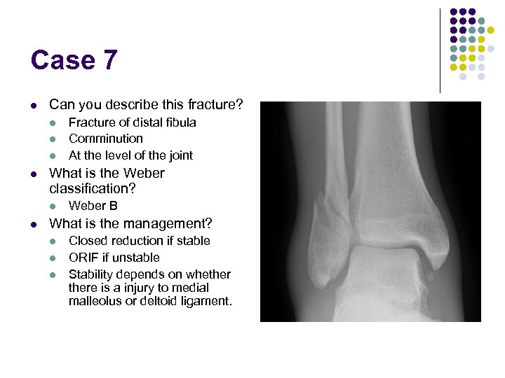Case 7 l Can you describe this fracture? l l What is the Weber classification? l l Fracture of distal fibula Comminution At the level of the joint Weber B What is the management? l l l Closed reduction if stable ORIF if unstable Stability depends on whethere is a injury to medial malleolus or deltoid ligament.