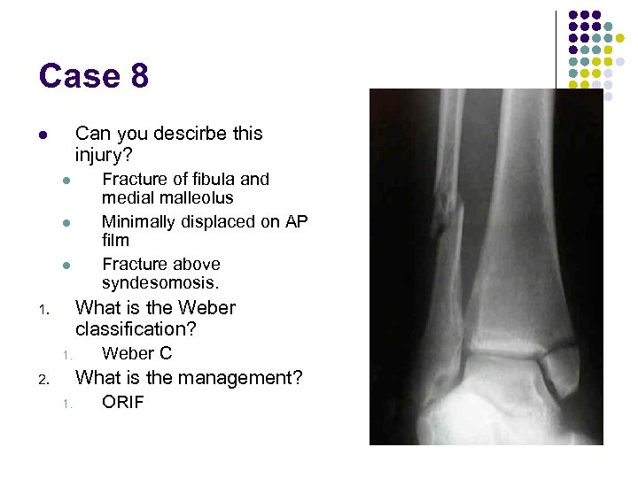 Case 8 Can you descirbe this injury? l l Fracture of fibula and medial malleolus Minimally displaced on AP film Fracture above syndesomosis. What is the Weber classification? 1. 1. Weber C What is the management? 2. 1. ORIF
