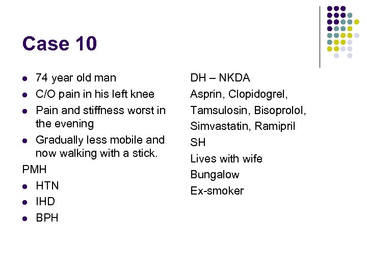 Case 10 74 year old man l C/O pain in his left knee l Pain and stiffness worst in the evening l Gradually less mobile and now walking with a stick. PMH l HTN l IHD l BPH l DH – NKDA Asprin, Clopidogrel, Tamsulosin, Bisoprolol, Simvastatin, Ramipril SH Lives with wife Bungalow Ex-smoker