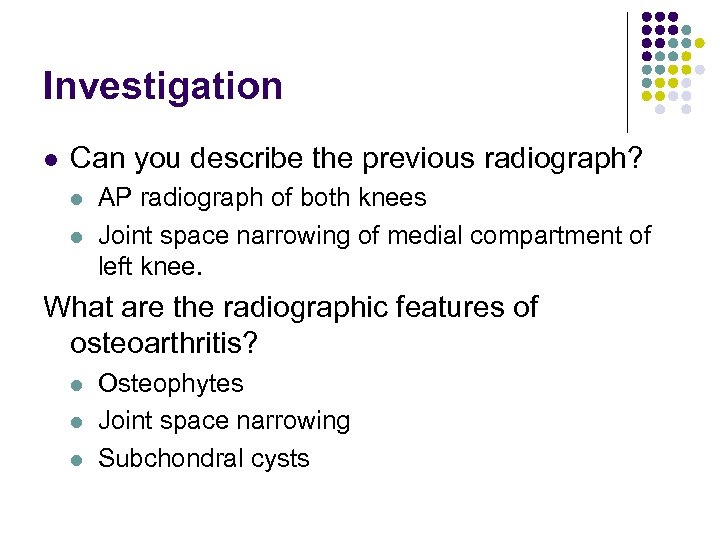 Investigation l Can you describe the previous radiograph? l l AP radiograph of both knees Joint space narrowing of medial compartment of left knee. What are the radiographic features of osteoarthritis? l l l Osteophytes Joint space narrowing Subchondral cysts