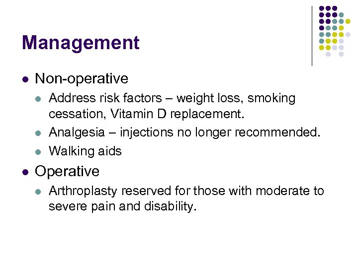 Management l Non-operative l l Address risk factors – weight loss, smoking cessation, Vitamin D replacement. Analgesia – injections no longer recommended. Walking aids Operative l Arthroplasty reserved for those with moderate to severe pain and disability.