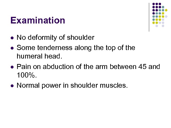 Examination l l No deformity of shoulder Some tenderness along the top of the humeral head. Pain on abduction of the arm between 45 and 100%. Normal power in shoulder muscles.