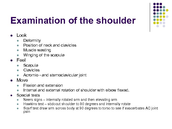 Examination of the shoulder l Look l l l Deformity Position of neck and clavicles Muscle wasting Winging of the scapula Feel l Scapula Clavicles Acromio - and sternoclavicular joint l Move l Flexion and extension l Internal and external rotation of shoulder with elbow flexed. Special tests l l Neers signs – internally rotated arm and then elevating arm Hawkins test – abdocut shoulder to 90 degrees and internally rotate Scarf test draw arm across body at 90 degrees to torso to see if exacerbates AC joint pain