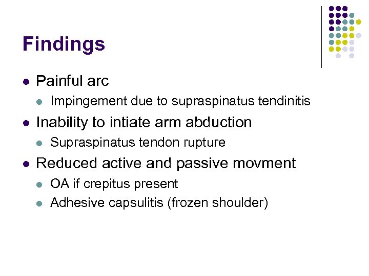 Findings l Painful arc l l Inability to intiate arm abduction l l Impingement due to supraspinatus tendinitis Supraspinatus tendon rupture Reduced active and passive movment l l OA if crepitus present Adhesive capsulitis (frozen shoulder)