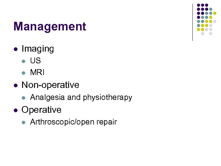 Management l Imaging l l l Non-operative l l US MRI Analgesia and physiotherapy Operative l Arthroscopic/open repair
