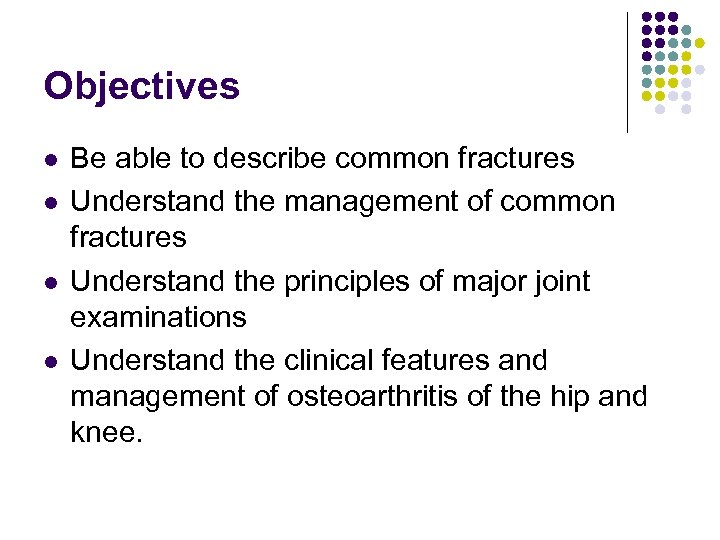 Objectives l l Be able to describe common fractures Understand the management of common fractures Understand the principles of major joint examinations Understand the clinical features and management of osteoarthritis of the hip and knee.