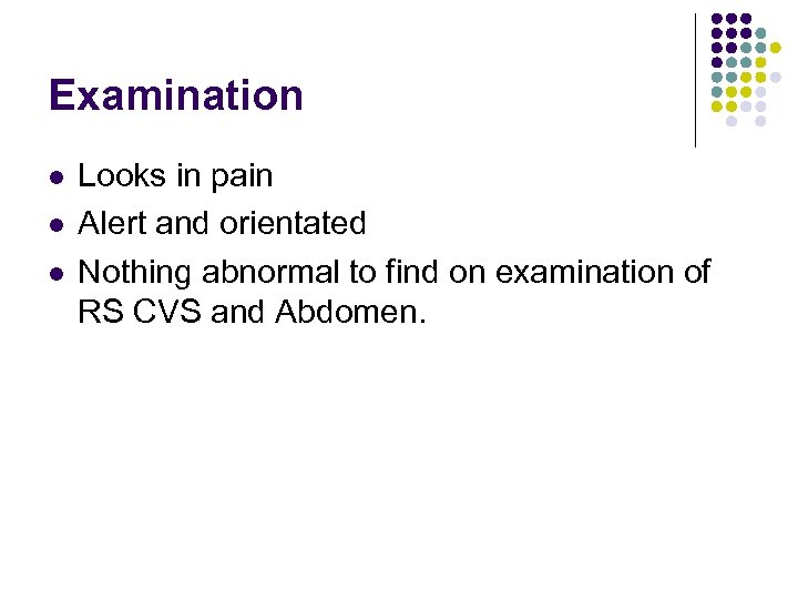 Examination l l l Looks in pain Alert and orientated Nothing abnormal to find on examination of RS CVS and Abdomen.