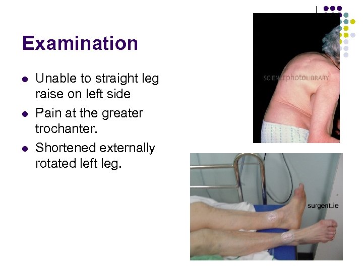 Examination l l l Unable to straight leg raise on left side Pain at the greater trochanter. Shortened externally rotated left leg.