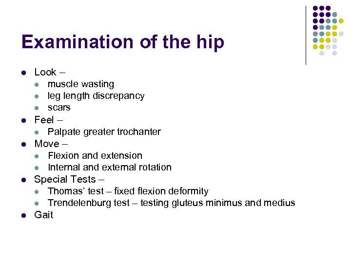 Examination of the hip l l l Look – l muscle wasting l leg length discrepancy l scars Feel – l Palpate greater trochanter Move – l Flexion and extension l Internal and external rotation Special Tests – l Thomas’ test – fixed flexion deformity l Trendelenburg test – testing gluteus minimus and medius Gait