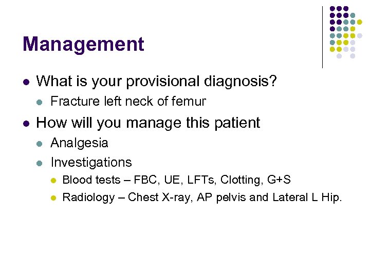 Management l What is your provisional diagnosis? l l Fracture left neck of femur How will you manage this patient l l Analgesia Investigations l l Blood tests – FBC, UE, LFTs, Clotting, G+S Radiology – Chest X-ray, AP pelvis and Lateral L Hip.