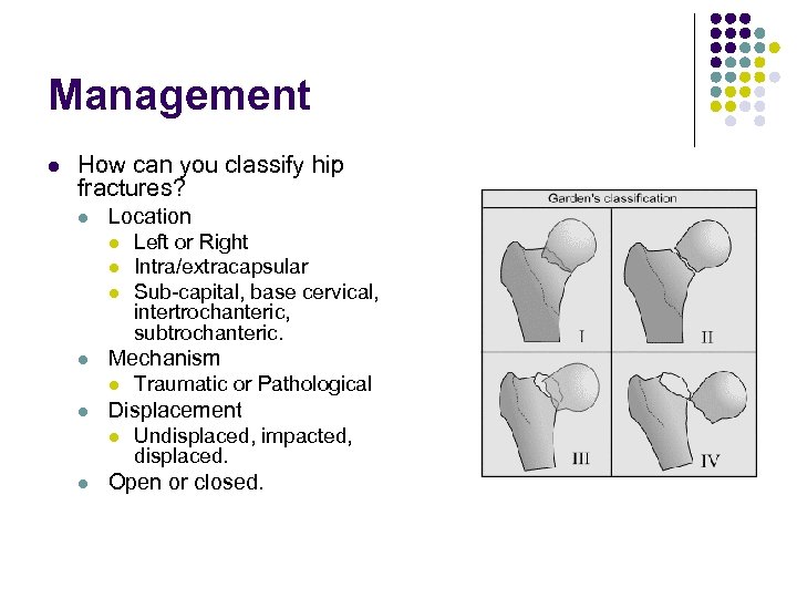 Management l How can you classify hip fractures? l Location l l Mechanism l l Traumatic or Pathological Displacement l l Left or Right Intra/extracapsular Sub-capital, base cervical, intertrochanteric, subtrochanteric. Undisplaced, impacted, displaced. Open or closed.