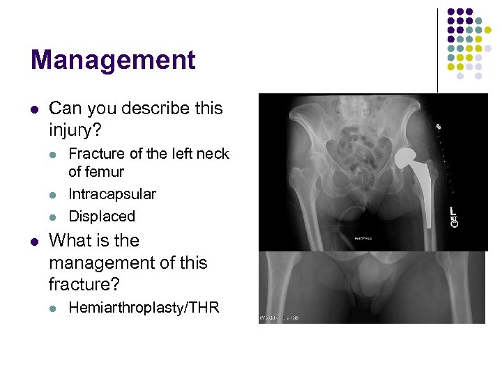 Management l Can you describe this injury? l l Fracture of the left neck of femur Intracapsular Displaced What is the management of this fracture? l Hemiarthroplasty/THR