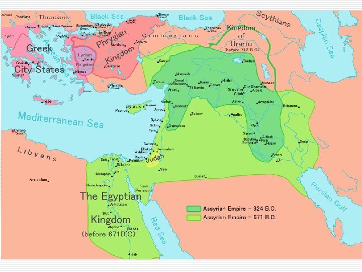 Assyrier och fenicier o Assyrierna utvecklade en organisation med anställda militärer, vilka var bågskyttar , kavalleri och infanteri o De gjorde under 700 t. f. kr. ett ambitiöst försök att expandera sitt rike från nuvarande Irak mot nuvarande Israel. o De förstod att utnyttja järnet för att förbättra rustningar och vapen. o De använde stridsvagnar. o Fenicierna utvecklade sjöstridskraften, som sedan grekerna (och främst atenarna) tog över.