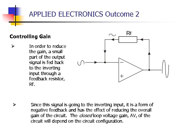 APPLIED ELECTRONICS Outcome 2 Controlling Gain Ø Ø In order to reduce the gain, a small part of the output signal is fed back to the inverting input through a feedback resistor, Rf. Since this signal is going to the inverting input, it is a form of negative feedback and has the effect of reducing the overall gain of the circuit. The closed loop voltage gain, AV, of the circuit will depend on the circuit configuration.