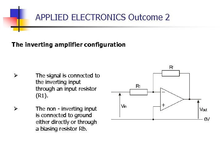 APPLIED ELECTRONICS Outcome 2 The inverting amplifier configuration Ø The signal is connected to the inverting input through an input resistor (R 1). Ø The non - inverting input is connected to ground either directly or through a biasing resistor Rb.