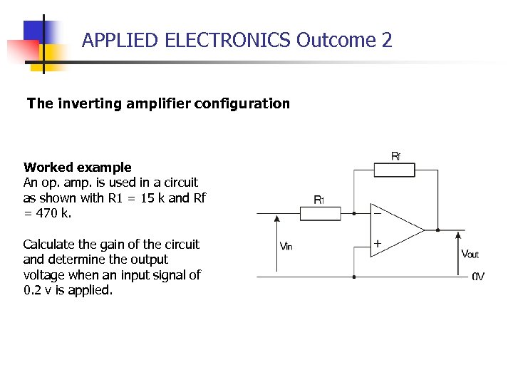APPLIED ELECTRONICS Outcome 2 The inverting amplifier configuration Worked example An op. amp. is used in a circuit as shown with R 1 = 15 k and Rf = 470 k. Calculate the gain of the circuit and determine the output voltage when an input signal of 0. 2 v is applied.