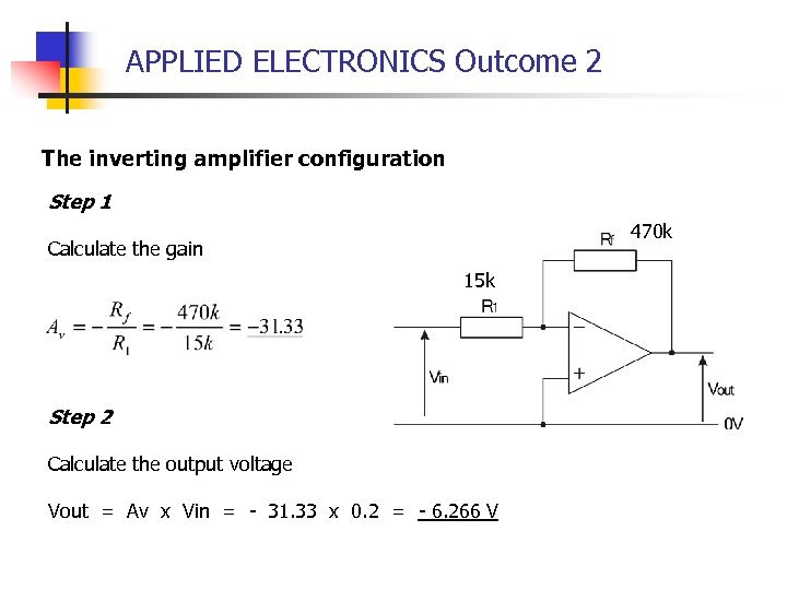 APPLIED ELECTRONICS Outcome 2 The inverting amplifier configuration Step 1 470 k Calculate the gain 15 k Step 2 Calculate the output voltage Vout = Av x Vin = - 31. 33 x 0. 2 = - 6. 266 V