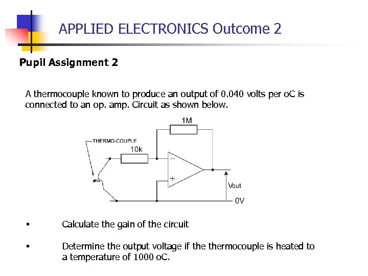 APPLIED ELECTRONICS Outcome 2 Pupil Assignment 2 A thermocouple known to produce an output of 0. 040 volts per o. C is connected to an op. amp. Circuit as shown below. § Calculate the gain of the circuit § Determine the output voltage if thermocouple is heated to a temperature of 1000 o. C.
