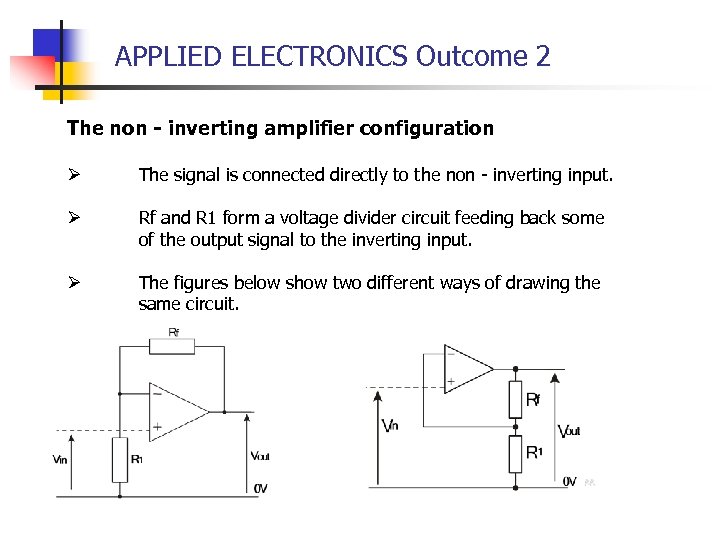 APPLIED ELECTRONICS Outcome 2 The non - inverting amplifier configuration Ø The signal is connected directly to the non - inverting input. Ø Rf and R 1 form a voltage divider circuit feeding back some of the output signal to the inverting input. Ø The figures below show two different ways of drawing the same circuit.