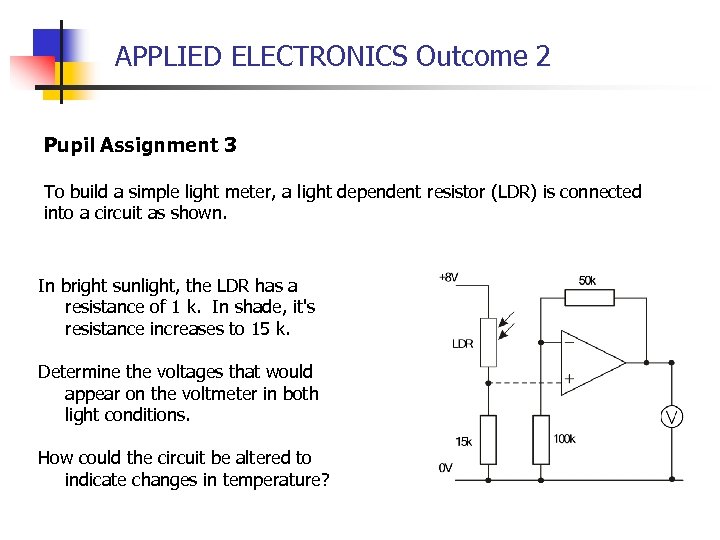APPLIED ELECTRONICS Outcome 2 Pupil Assignment 3 To build a simple light meter, a light dependent resistor (LDR) is connected into a circuit as shown. In bright sunlight, the LDR has a resistance of 1 k. In shade, it's resistance increases to 15 k. Determine the voltages that would appear on the voltmeter in both light conditions. How could the circuit be altered to indicate changes in temperature?