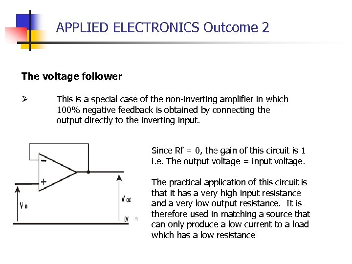 APPLIED ELECTRONICS Outcome 2 The voltage follower Ø This is a special case of the non-inverting amplifier in which 100% negative feedback is obtained by connecting the output directly to the inverting input. Since Rf = 0, the gain of this circuit is 1 i. e. The output voltage = input voltage. The practical application of this circuit is that it has a very high input resistance and a very low output resistance. It is therefore used in matching a source that can only produce a low current to a load which has a low resistance