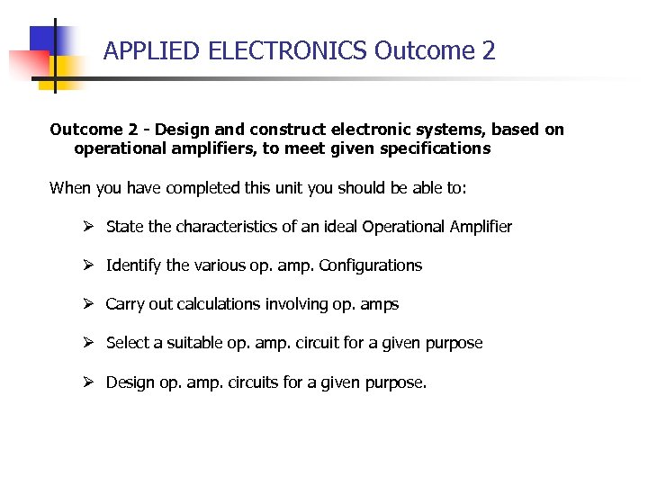 APPLIED ELECTRONICS Outcome 2 - Design and construct electronic systems, based on operational amplifiers, to meet given specifications When you have completed this unit you should be able to: Ø State the characteristics of an ideal Operational Amplifier Ø Identify the various op. amp. Configurations Ø Carry out calculations involving op. amps Ø Select a suitable op. amp. circuit for a given purpose Ø Design op. amp. circuits for a given purpose.