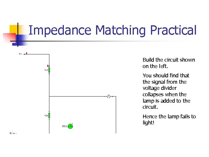 Impedance Matching Practical Build the circuit shown on the left. You should find that the signal from the voltage divider collapses when the lamp is added to the circuit. Hence the lamp fails to light!