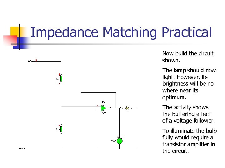 Impedance Matching Practical Now build the circuit shown. The lamp should now light. However, its brightness will be no where near its optimum. The activity shows the buffering effect of a voltage follower. To illuminate the bulb fully would require a transistor amplifier in the circuit.