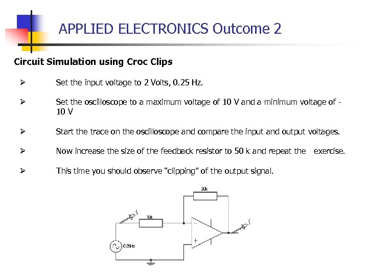 APPLIED ELECTRONICS Outcome 2 Circuit Simulation using Croc Clips Ø Set the input voltage to 2 Volts, 0. 25 Hz. Ø Set the oscilloscope to a maximum voltage of 10 V and a minimum voltage of 10 V Ø Start the trace on the oscilloscope and compare the input and output voltages. Ø Now increase the size of the feedback resistor to 50 k and repeat the exercise. Ø This time you should observe “clipping” of the output signal.