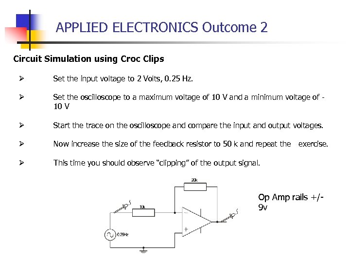 APPLIED ELECTRONICS Outcome 2 Circuit Simulation using Croc Clips Ø Set the input voltage to 2 Volts, 0. 25 Hz. Ø Set the oscilloscope to a maximum voltage of 10 V and a minimum voltage of 10 V Ø Start the trace on the oscilloscope and compare the input and output voltages. Ø Now increase the size of the feedback resistor to 50 k and repeat the exercise. Ø This time you should observe “clipping” of the output signal. Op Amp rails +/9 v