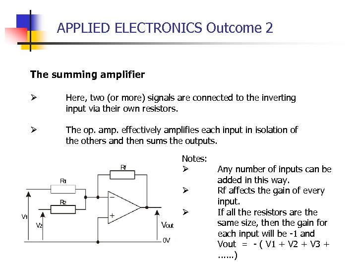APPLIED ELECTRONICS Outcome 2 The summing amplifier Ø Here, two (or more) signals are connected to the inverting input via their own resistors. Ø The op. amp. effectively amplifies each input in isolation of the others and then sums the outputs. Notes: Ø Ø Ø Any number of inputs can be added in this way. Rf affects the gain of every input. If all the resistors are the same size, then the gain for each input will be -1 and Vout = - ( V 1 + V 2 + V 3 +. . . )