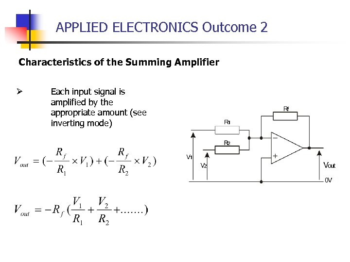 APPLIED ELECTRONICS Outcome 2 Characteristics of the Summing Amplifier Ø Each input signal is amplified by the appropriate amount (see inverting mode)