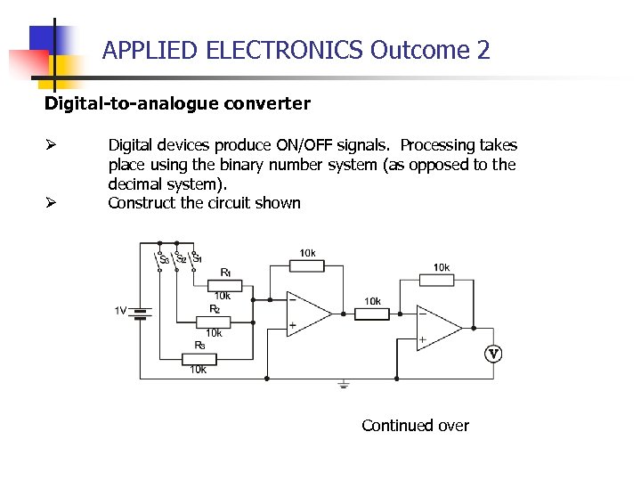APPLIED ELECTRONICS Outcome 2 Digital-to-analogue converter Ø Ø Digital devices produce ON/OFF signals. Processing takes place using the binary number system (as opposed to the decimal system). Construct the circuit shown Continued over